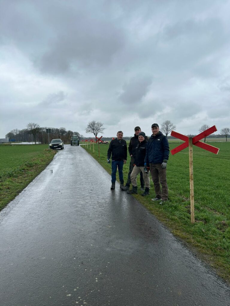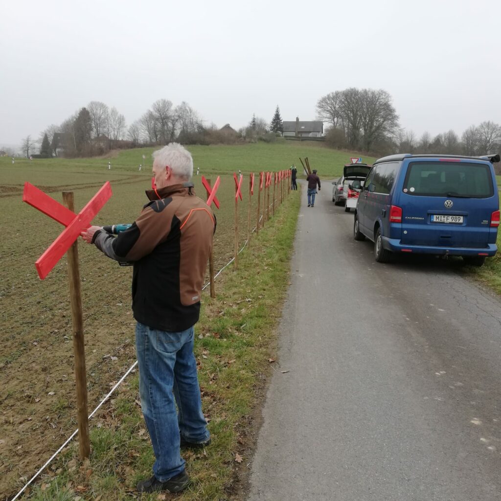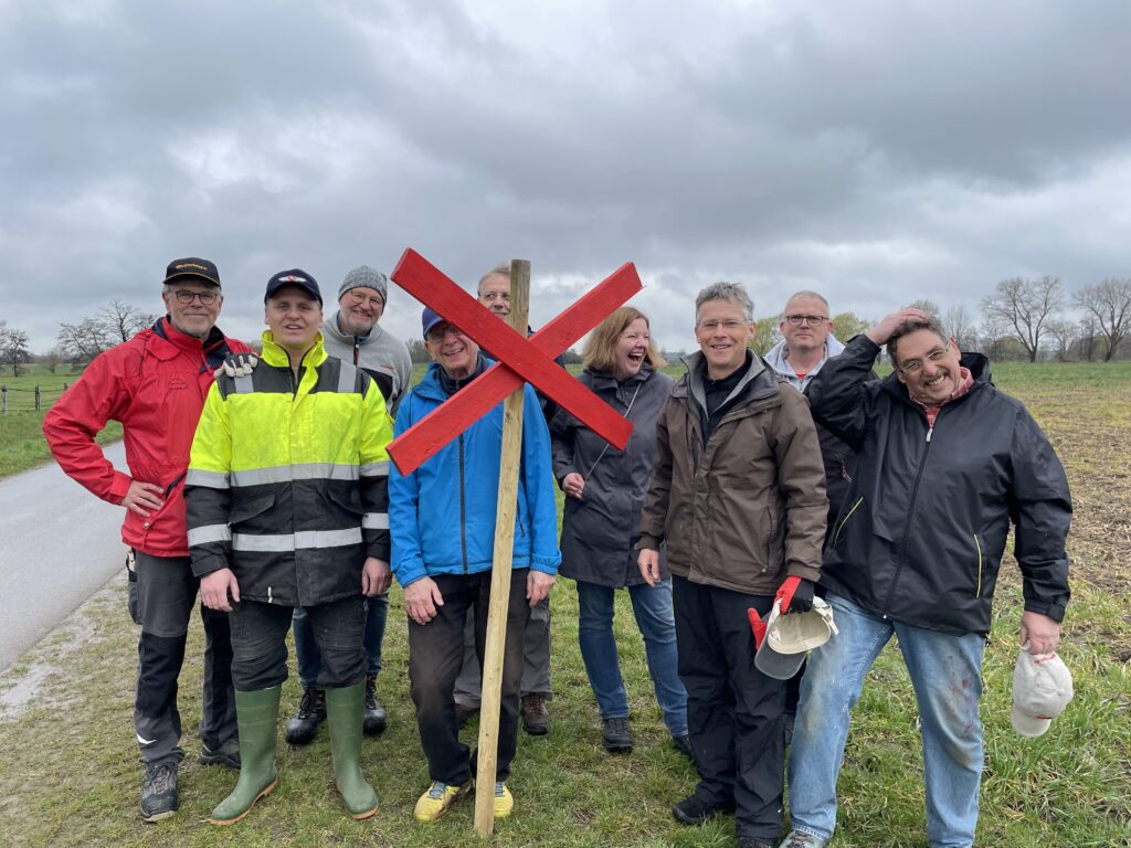 Tatkräftig unterstützt von unserem Ortsbürgermeister Karsten Grobe haben wir symbolische Andreaskreuze parallel zum geplanten Verlauf der neuen ICE-Trasse Hannover-Bielefeld aufgestellt. Damit sollen die roten Kreuze einen sichtbaren Protest gegen die Neubaupläne der Bahn und des Bundesverkehrsministeriums darstellen.