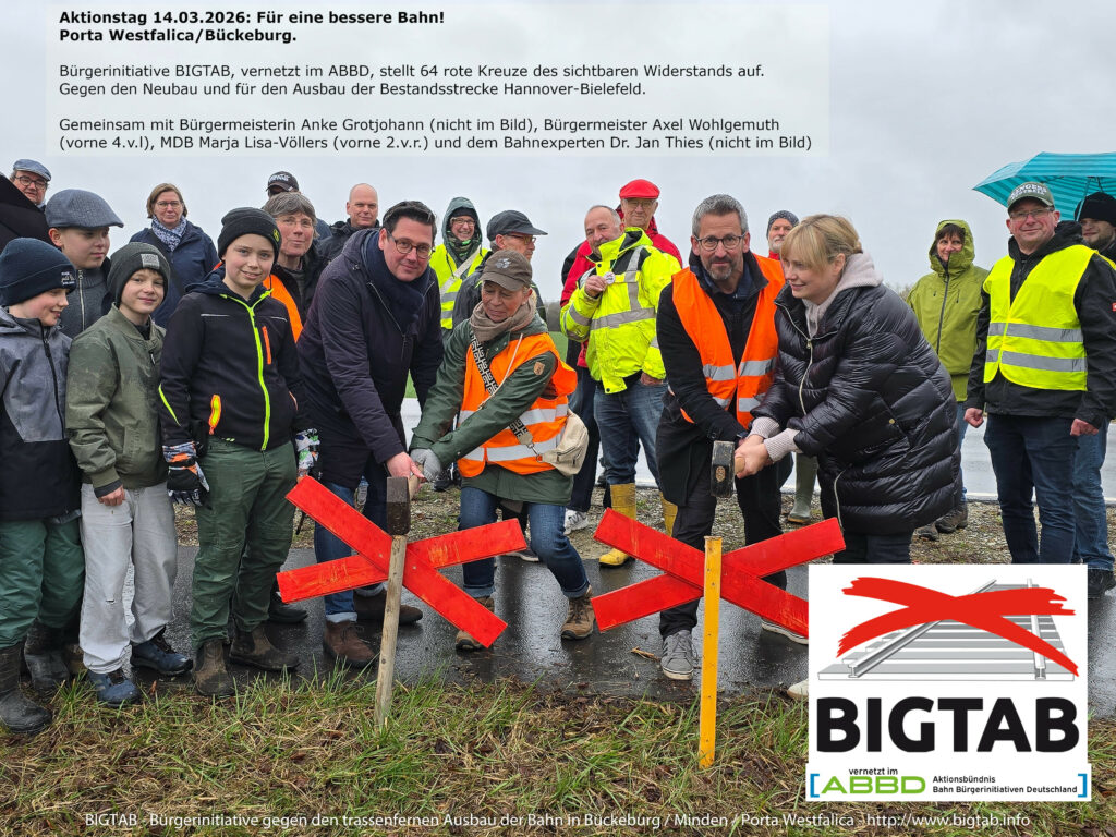 Wie in jedem Jahr so hat auch in diesem Jahr das Aktionsbündnis Bahn Bürgerinitiativen Deutschland (ABBD), in dem mehr als 50 Bürgerinitiativen deutschlandweit zusammengeschlossen sind, zu einem Aktionstag am 14.3. unter dem Motto: „Für eine bessere Bahn“ aufgerufen. Wir haben diesen Aufruf genutzt, um den Trassenverlauf zu verdeutlich und um auf unsere Ziele hinzuweisen.
